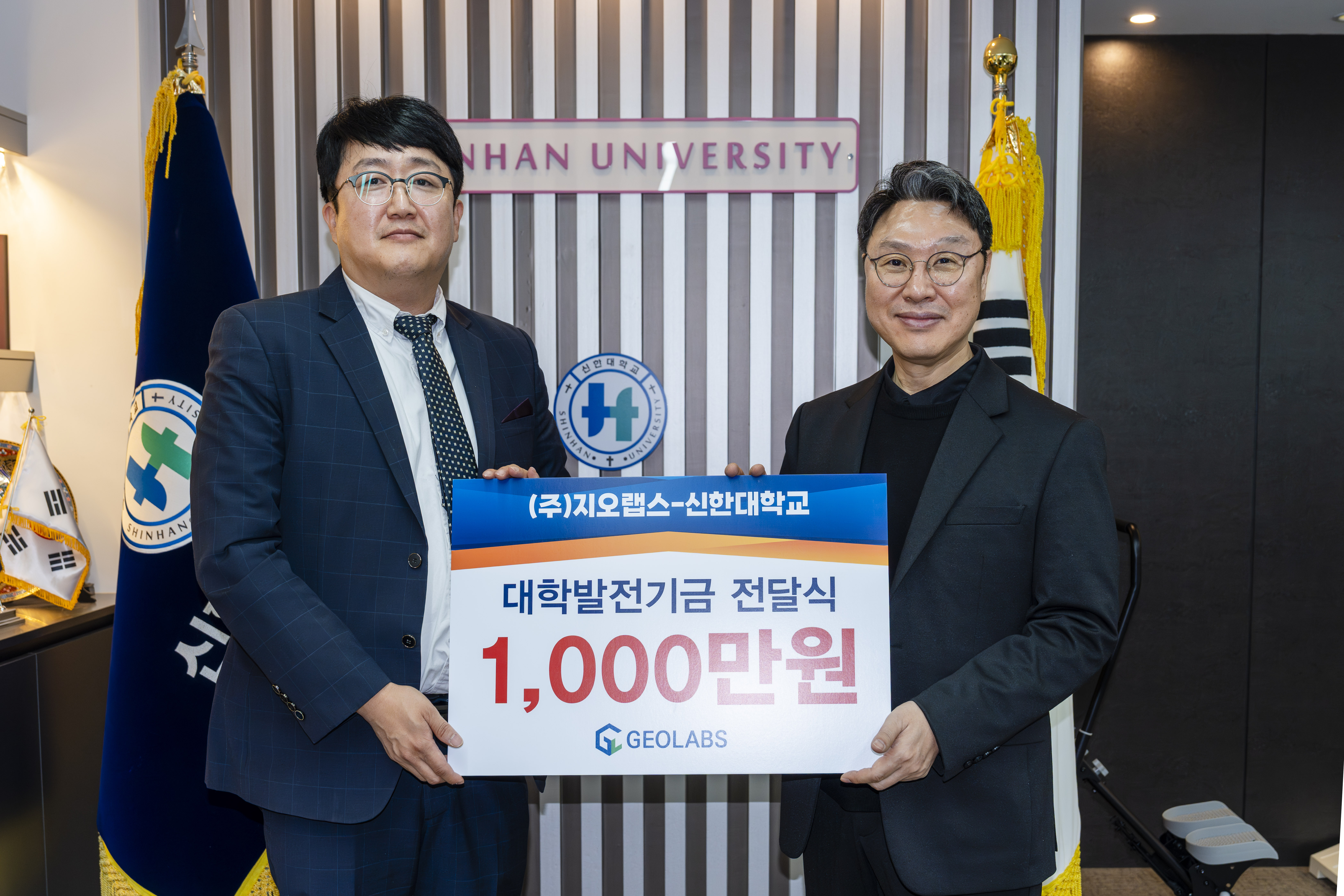 신한대학교(총장 강성종)와 ㈜지오랩스(대표 김성학)은 경기도 의정부시에 위치한 신한대학교 총장실에서 상호발전과 미래세대 인재 양성을 위한 사회공헌 실현을 위한 대학발전기금 전달식을 2025년 10월 28일 개최하였다.