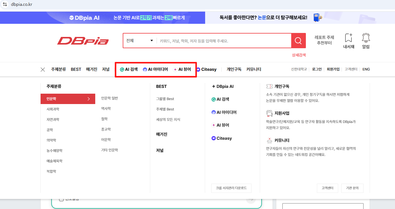중앙도서관에서는 구성원의 학습과 학술연구 지원을 위해 신규 도입된 DBpia AI 서비스를 한시적으로 제공하고 있습니다.