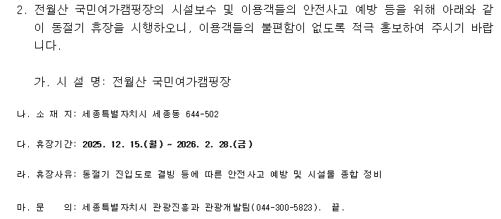 전월산 국민여가캠핑장 동절기 휴장 안내