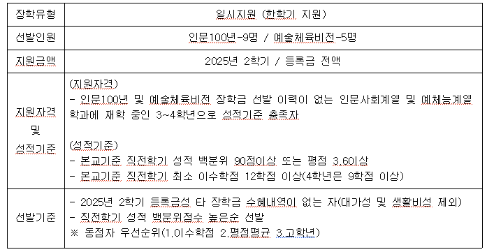 2025년도 인문100년 및 예술체육비전 장학금 일시지원(한학기) 장학생을 선발하고자 하니,
