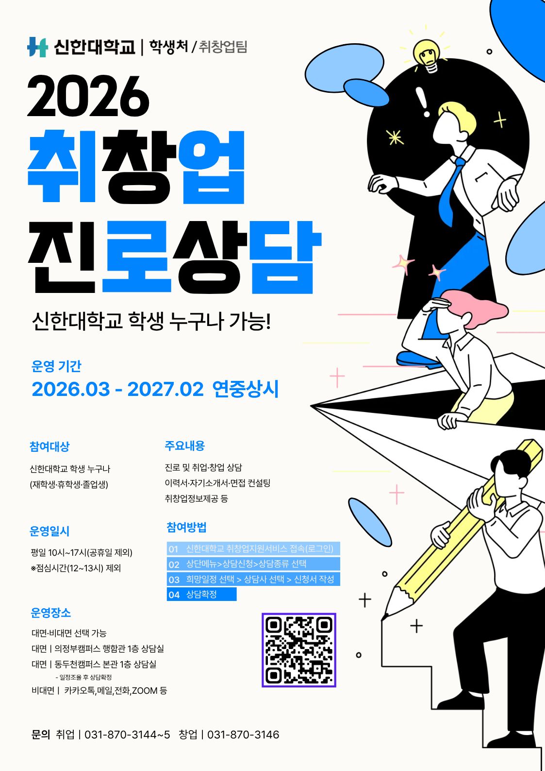 신한대학교 학생처 취창업팀에서 2026학년도 취·창업진로상담 프로그램을 안내합니다.
